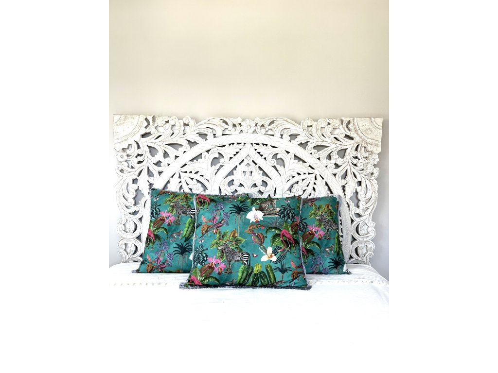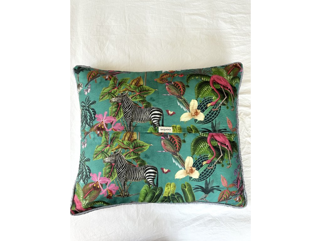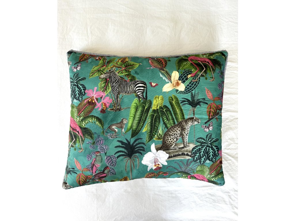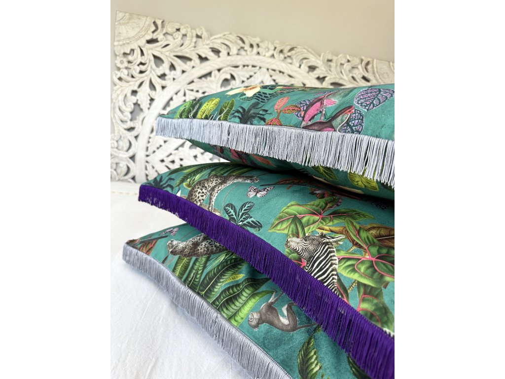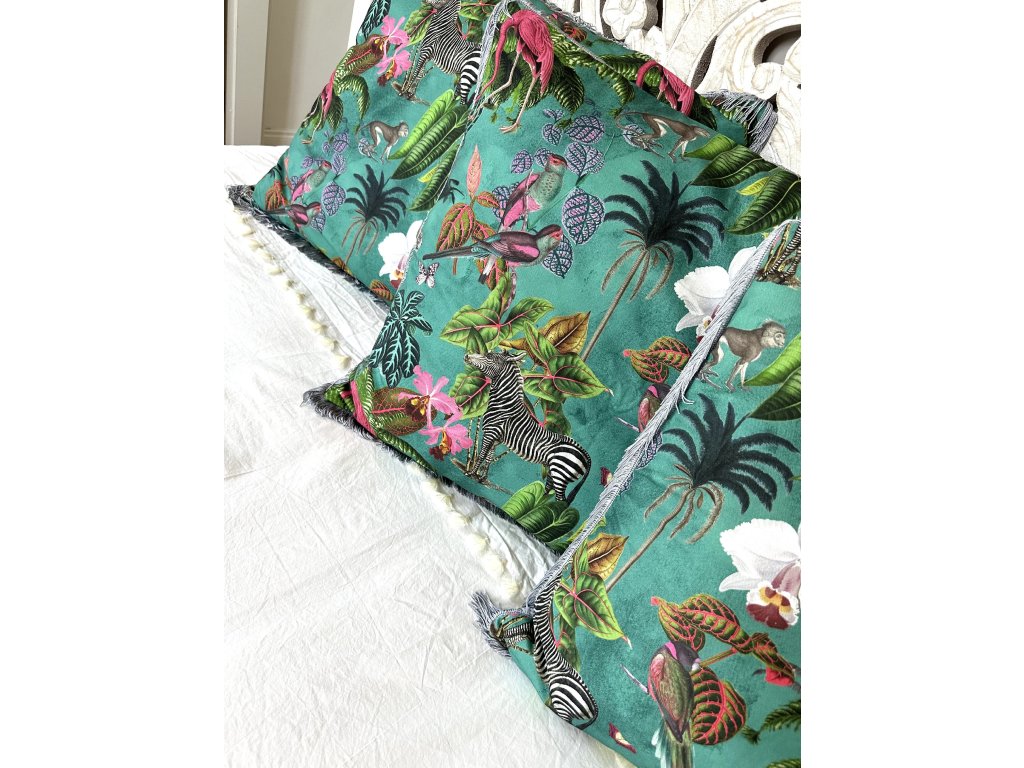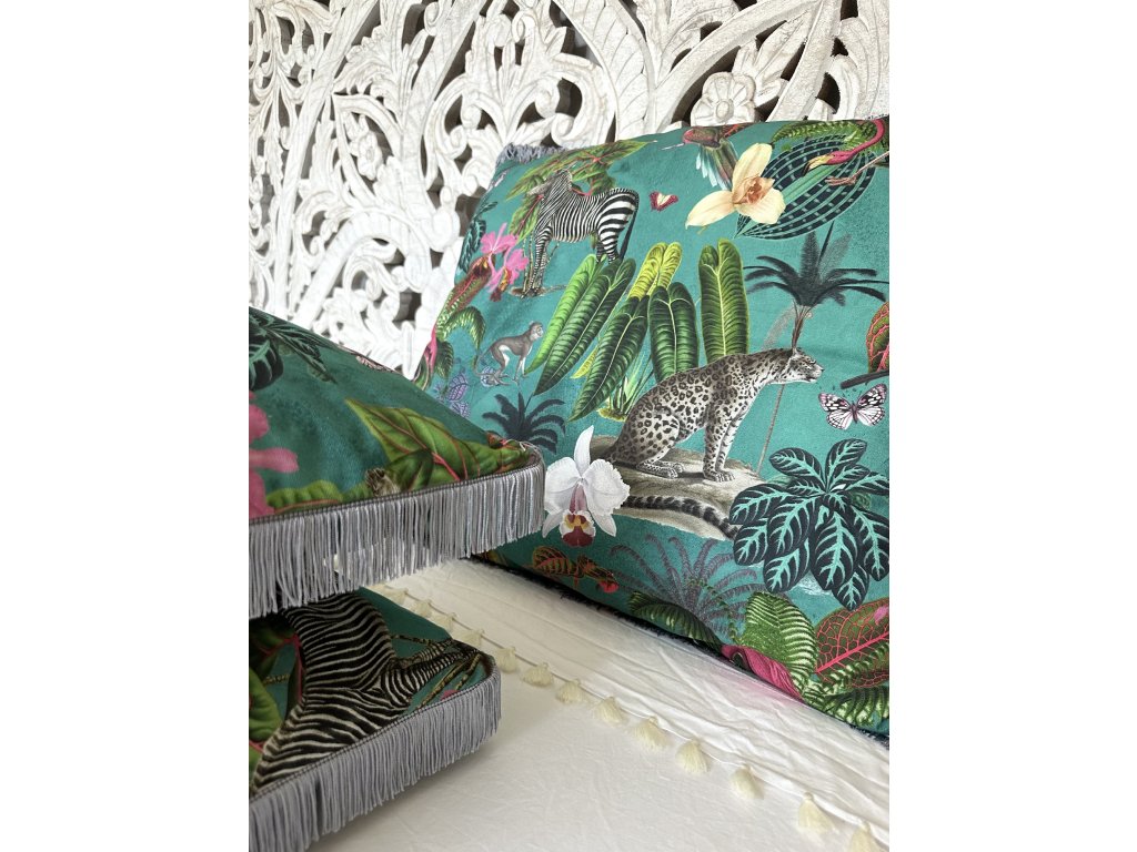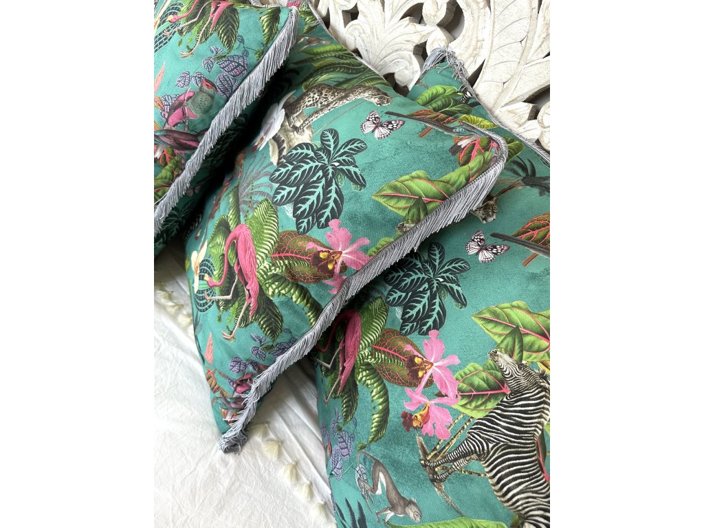 Dekorativní polštář z organické bavlny s motivem džungle, lemovaný ozdobnými třásněmi.